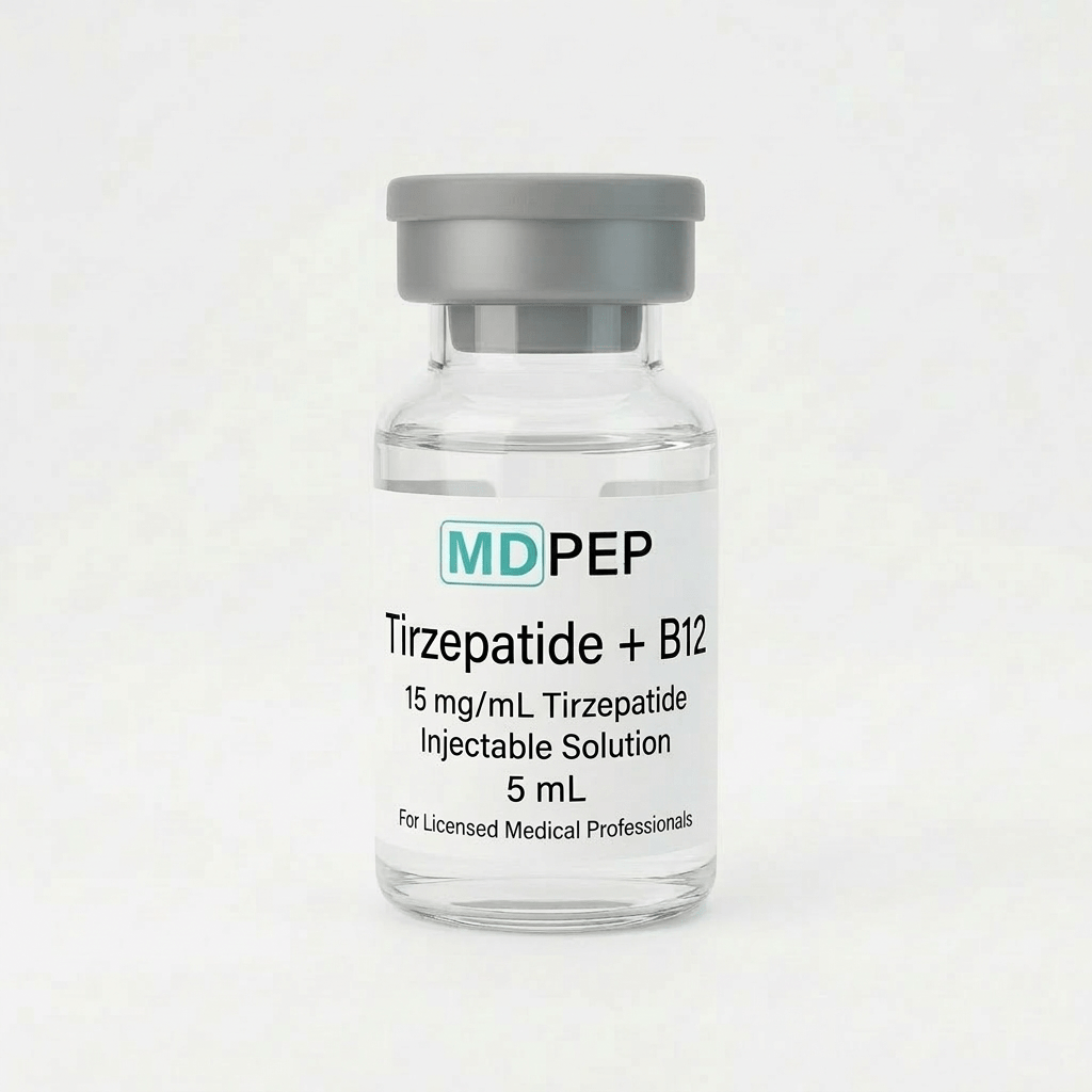 This vial contains Tirzepatide + B12 supplied at a strength or concentration of 15 mg/mL Tirzepatide and is manufactured in a 503B FDA-registered outsourcing facility in accordance with high quality standards. This product is intended for use by qualified healthcare providers in a clinical setting.